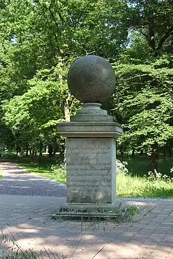- Unter der Aufsicht und Leitung der Garten Deputation ist dieser Park seit dem Jahre 1818 ausgeführt, erweitert und gepflegt von dem Stadtbaumeister Wolff mit den Kunst Gärtnern Minding u. Erich. Dieses Denkmal ist gesetzt von dem St.B. Wolff beim Ablauf seiner 56jährigen Dienstzeit im Jahre 1861. C. Schönberg fecit.