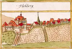 Die aus dem ursprünglichen Hochberger Ortsadel stammenden Renhard und Johann von Hohenberg übereigneten ihr Eigengut an Hochberg 1291 an Berthold von Mühlhausen. Dieser übergab den Besitz an Eberhard von Württemberg und ließ sich dann damit belehnen.