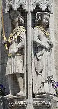 Otto III: (980–1002) starb unverheiratet. Die Identität der Frau an seiner Seite ist ungeklärt. Es wurde vermutet, dass es sich bei der Dargestellten entweder um seine Mutter Theophanu (s. o.) handeln könnte oder um seine Großmutter väterlicherseits Adelheid von Burgund (s. o.). Für Braunschweig wahrscheinlicher erscheint hingegen, dass die Statue Maria von Aragon darstellt, bei der es sich nach einer im Spätmittelalter in Braunschweig verbreiteten Legende, die als historische Wahrheit betrachtet wurde, um die Ehefrau Otto III. handeln solle.[33][34] (Historische) Belege für eine Ehe Otto III. existieren indes nicht. Johann Georg Leuckfeld hatte bereits in seinem 1714 erschienenen Werk Antiquitates Halberstadenses darauf hingewiesen, dass Otto III. nicht verheiratet gewesen war.[35] Auch Carl Schiller hatte 1852 nochmals darauf hingewiesen, dass es sich um angebliche Ehefrau Maria Sophie von Aragonien handeln könne, Otto III. aber unverheiratet war.[36] | |