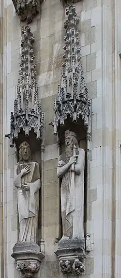 Die künstlerische Qualität der Figuren auf der Westseite wird im Allgemeinen als geringer als die auf der Nordseite betrachtet.[29] So beschrieb sie der Kunsthistoriker Wolfgang Scheffler als stumpfsinnig, leblos starr, roh.[30] Die Köpfe seien im Vergleich zum Körper zu groß geraten, Körperhaltung und Gestik seien starr und die Gewänder, insbesondere deren Falten, seien wenig ausgestaltet.