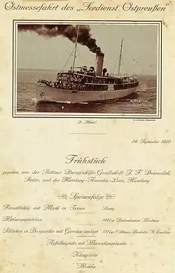 Die Kaiserliche Marine erfasste am 6. August 1914 das Dampfschiff und ließ es zunächst zum Hilfs-Lazarettschiff E umbauen. Als solches kam es jedoch nicht in Fahrt, sondern, nach erneutem Umbau, ab September 1914 als Hilfsminenschiff. Nach dem Ersten Weltkrieg erhielt die Reederei ihr Schiff zurück und setzte es im Seedienst Ostpreußen und zu gelegentlichen Fahrten nach Bornholm und Kopenhagen ein.