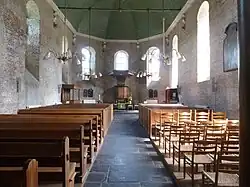 Der unverputzte Innenraum wird durch ein hölzernes Tonnengewölbe bestimmt, aufgesetzt auf einer rundum verlaufenden hölzernen Konsole. Jeweils vier Bleiglasfenster an den beiden Seitenwänden und drei in der Apsis sorgen mit verschiedenen Motiven eines unbekannten Künstlers für eine stimmungsvolle Beleuchtung des Kirchenschiffes.