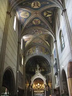 Die Kirche wurde im neuromanischen Stil aus rötlich-violetten Porphyrsteinen als Basilika mit einer Doppelturmfassade geschaffen. An dieser befindet sich eine sechzehnteilige Rosette, ein Mosaik von Ignaz Stolz in der Fassadengalerie, die Neun Chöre der Engel darstellend, und im Tympanon des Rundbogentores ein Relief mit dem Bild Rudolf von Habsburgs von Alois Winkler. An einem der beiden 40 Meter hohen Türme ist eine Uhr und darunter die halb vergoldete, halb blaue Kugel des Mondes, die sich mit den Mondphasen dreht. Die sieben Glocken stammen von der Firma Colbacchini aus Trient; die größte davon wiegt 3071 kg.