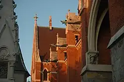 Nach langen Diskussionen über den Baustil (der Bau einer Kirche nach Art der Wiener Votivkirche musste aus Kostengründen verworfen werden) wurde schließlich der aus Graz stammende Georg von Hauberrisser, Architekt des Münchner Rathauses, mit der Errichtung der Kirche im neugotischen Backsteinstil nach Art der norddeutschen Kirchen im Stil der Backsteingotik beauftragt. Die Grundsteinlegung erfolgt 1881, im Jahr 1885 wurde Dachgleiche gefeiert und 1887 der hohe Turm fertiggestellt. Am 5. Juni 1891 wurde die Kirche geweiht, aber erst am 10. Oktober 1902 zur Pfarrkirche erhoben. In den Jahren 2004 und 2005 wurde eine umfassende Außenrestaurierung durchgeführt (siehe Weblinks).