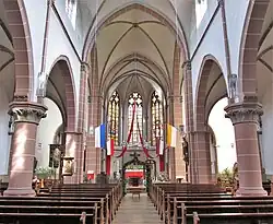 Bei dem Kirchengebäude, das im Stil der Neugotik errichtet wurde, handelt es sich um eine dreischiffige Basilika. Das Langhaus, unterteilt in ein Mittelschiff und zwei niedrigere Seitenschiffe, weist eine Unterteilung in drei Joche auf. An das Langhaus schließt sich ein Querschiff an, daran ein fünfseitiger Chor mit polygonalem Abschluss. Somit ergibt sich als Grundriss die Form eines Lateinischen Kreuzes. Die Decken der drei Schiffe werden von Kreuzrippengewölben geformt. Dem Langhaus vorangestellt ist ein Kirchturm mit Spitzhelm.