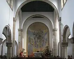 Bei der Umgestaltung des Altarraums 1974/75 wurde die funktionslos gewordene Kommunionbank entfernt und eine in den Raum vorgerückte Altarinsel geschaffen. Den Altar und den Ambo gestaltete der Bildhauer Frido Lehr. Die reichhaltige Ausmalung der Kirche ging im Zweiten Weltkrieg verloren. 1960 schuf Rudolf Kaufhold ein neues Altarraumbild. Es zeigt Jesus Christus mit einladender Geste. Zu seinen Füßen sind die Heiligen Vinzenz Pallotti, Bernhard von Baden, Karl Borromäus, Laurentius, Agnes, Margareta Maria Alacoque, Johannes und Theresia dargestellt. Der geschnitzte Kreuzweg stammt von 1905.
