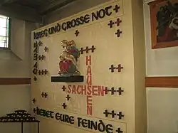 Nach einer Pilgerfahrt von DDR-Bürgern 1984 nach Rom entstand auf Veranlassung des damaligen Papstes Johannes Paul II. an der inneren Stirnwand des Kirchenraums eine Gedenkstätte für die Opfer des KZ Sachsenhausen, die 1987 eingeweiht wurde. Sie wurde vom Künstler Georg Kurze[14] geschaffen und befindet sich unter der Orgelempore zwischen dem Mittelgang und der Fensterseite. Es ist eine rechteckige senkrecht angebrachte große weiße Platte, auf welcher in schwacher grauer Schrift die Ermordeten erwähnt werden, auch durch kleine plastische Kreuze symbolisiert. In roten Versalien ist waagerecht SACHSEN geschrieben, gekreuzt von HAUSEN (senkrecht). Auf dem linken Arm dieses Wort-Kreuzes ruht eine farbige Pietà als Blickpunkt der Tafel. Ein Schriftband oben und seitwärts trägt die Inschriften: „Da war Krieg und grosse Not.“ Am unteren Tafelrand heißt es „Liebet eure Feinde“.[13]