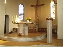 Der Altarbereich liegt hinter dem Triumphbogen und bildet eine Halbrundapsis, in der ein schlichter Altartisch steht. An der Wand dahinter hängt mittig ein geschnitztes Kruzifix, rechts und links daneben sind zwei kleinere Halbrundfenster in das Mauerwerk eingefügt. In den Hauptraum ragen zwei übereinander angeordnete gerundete Podien.[13]