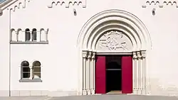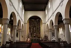 Das Langhaus ist dreischiffig. In der Vorhalle befinden sich zwei Kapellen: die Familien-Kapelle und die Krieger-Kapelle. Die Ausstattung und Einrichtung der Kirche sind schlicht gehalten. Der Altarraum und weitere Elemente wurden in den 1950er Jahren von Ernst Bauernfeind neu gestaltet.[1]
