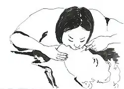 Zur Durchführung der Herzdruckmassage wird bei Kindern nur ein Handballen benutzt. Für Säuglinge verwendet man zwei Finger oder umfasst den Brustkorb mit beiden Händen und drückt ihn (bei Zusammenarbeit von zwei Helfern) mit den Daumen ein. Die Drucktiefe sollte etwa 1/3 des Brustkorbdurchmessers betragen. Die Abfolge nach den fünf initialen Atemhüben beträgt für den Ersthelfer – wie beim Erwachsenen – 30 Herzdruckmassagen zu zwei Beatmungen; für medizinisches Personal gilt ein Druckverhältnis von 15:2, wenn mehrere Helfer anwesend sind. Bei Neugeborenen, die zudem vor Wärmeverlusten geschützt werden müssen, wird ein Verhältnis von 3:1 eingesetzt.[34][35]