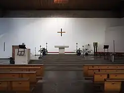 Die nahezu T-förmige Raumfamilie mit 780 Sitzplätzen ist in verschiedenen Ebenen angelegt und gliedert sich vor allem in zwei virtuelle Achsen, bestehend aus dem größeren Hauptraum mit 40 m Länge und 18 m Breite in West-Ost-Richtung und dem kleineren, querschiffartigen in Nord-Süd-Richtung für kleinere Gottesdienstformen. Beide Achsen treffen sich auf der siebenstufigen Altarinsel. Das Dach wir in einer lichten Höhe von 11 m durch acht, jeweils 20 Tonnen wiegende Spannbetonbinder getragen, welche eine stützenfreie Konstruktion ermöglichen.[1]