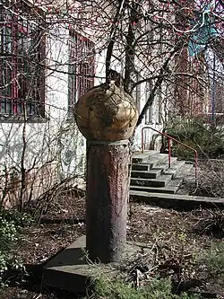 - Eine Quelle[49] gibt den Hinweis auf eine künstlerisch gestaltete Keramiksäule von Doris Pollatschek, die vor der ehemaligen Berufsschule für Handel (später Kulturhaus Elektrokohle) stand. Die Säule stellt die Erdkugel auf einem Ständer dar und ist stark von der Witterung geschädigt. Zwischen etwa 2010 und 2015 war das Kunstwerk dauerhaft eingehaust, später auch eingelagert. Seitdem das ehemalige Kulturhaus neu aufgebaut wird, ist die Einhausung verschwunden, die Säule wieder sichtbar (siehe Bild).