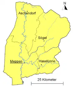 Als Standesherr verfügte der Herzog im Gebiet Meppen über beträchtliche Rechte. Er hatte die untere Gerichtsbarkeit, die Schulaufsicht und die Polizeiverwaltung inne. Das Land wurde von arenbergischen Beamten verwaltet. Beaufsichtigt wurde dies durch den hannoverschen Landdrost in Osnabrück. Eingeteilt war das Gebiet in vier Mediatämter. Dies waren die Ämter Meppen, Haselünne, Hümmling und Aschendorf. Diesen war in Bezug auf die Rechtsprechung die Standesherrliche Herzoglich-Arenbergische Justiz-Kanzley zu Haselünne als Gericht zweiter Instanz übergeordnet. Nach der Revolution von 1848 wurde im Königreich Hannover die Rechtsprechung von der Verwaltung getrennt und die Patrimonialgerichtsbarkeit abgeschafft.[11] Stattdessen wurden daraufhin mit der Verordnung vom 7. August 1852 die Bildung der Amtsgerichte und unteren Verwaltungsbehörden betreffend königlich hannoversche Amtsgerichte gegründet. In Bezug auf die Standesherrschaft waren dies die Amtsgerichte Meppen, Haselünne, Hümmling und Aschendorf.[12]