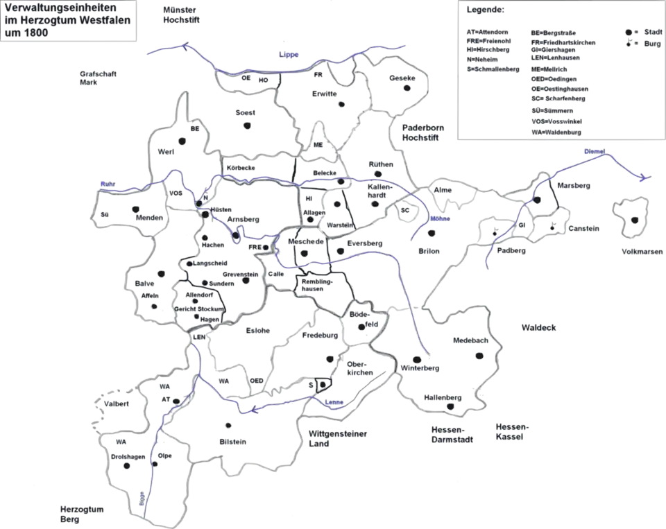 - ↑ Hans-Joachim Behr: Staat und Politik im 19. Jahrhundert. In: Harm Klueting (Hrsg.): Das Herzogtum Westfalen. Bd. 2, Teilbd. 1: Das ehemalige kurkölnische Herzogtum Westfalen im Bereich der heutigen Kreise Hochsauerland, Olpe, Soest und Märkischer Kreis (19. und 20. Jahrhundert). Münster 2012, S. 26f.