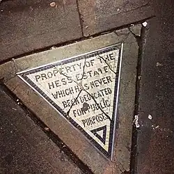 Die Kachel trägt die Beschriftung „Property of the Hess Estate which has never been dedicated for public purposes“ („Eigentum der Hess-Erben, welches niemals für öffentliche Zwecke freigegeben wurde“).[1] Es handelt sich um ein gleichschenkliges Dreieck mit einer 25 ½ inch (65 cm) langen Basis und 27 ½ inch (70 cm) langen Seiten,[1] was eine Fläche von knapp über 0,2 Quadratmetern ist.