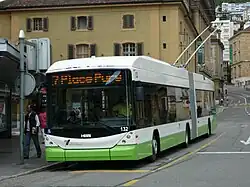 Auch der Swisstrolley verfügt über permanenterregte Synchron-Motoren sowie eine Traktionsbatterie und Lademöglichkeiten über Fahrleitung und örtlicher Ladestation.[27] Neben einer intelligenten Ladekontrolle verfügt dieser Prototyp auch über eine angepasste Heizung und Kühlung, die es erlaubt, den Energiebedarf gegenüber konventionellen Trolleybussen um rund 15 % zu senken. Im Batteriemodus erreicht das Fahrzeug im Linienbetrieb dadurch Reichweiten von rund 10 km, was einen fahrleitungslosen Betrieb auf bis zu 60 % der Linie erlaubt. Bei Leerfahrten kann eine Distanz von rund 35 km ohne Fahrleitung zurückgelegt werden.[28][29]