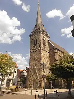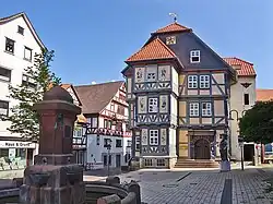 in der Landgrafenstraße: gotische evangelische Pfarrkirche[25] aus dem 14. Jahrhundert und das Rathaus von 1656 mit dem städtischen Wahrzeichen am Giebel,