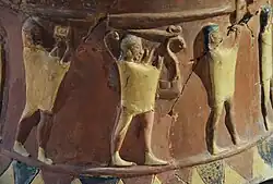 Ein späthethitisches Relief aus Karkamis (9. Jahrhundert v. Chr.) zeigt eine Trommel von etwa einem Meter Durchmesser, die von zwei Männern mit Tragriemen getragen und geschlagen wird, ein dritter Mann steht hinter der Trommel, seine Funktion ist jedoch nicht ersichtlich.[20] Reliefs aus Zincirli (8. Jahrhundert v. Chr.) zeigen Männer, die mit der linken Hand eine Rahmentrommel halten, die sie mit der flachen rechten Hand schlagen.[21]