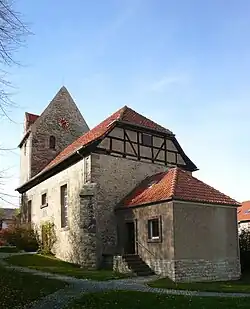 Das derzeit einzige als Baudenkmal ausgewiesene Gebäude in Hetjershausen ist die evangelisch-lutherische Kirche St. Marien.[10][14] Der Kirchturm aus der Zeit um 1300 ist der älteste Teil der Kirche, er misst im Grundriss 7,20 mal 6,70 m und hat eine Mauerstärke von etwa 1,70 m (im Erdgeschoss). Das unterste Geschoss ist mit einem Gewölbe überdeckt und besitzt keine direkte Verbindung zu den oberen Geschossen. In den unteren Geschossen weist der Turm nur sehr kleine schlitzartige Fensteröffnungen auf, lediglich das mit Kamin ausgestattete oberste Geschoss besitzt größere Fenster. Eine regionale Besonderheit ist das von Schildgiebeln eingefasste Satteldach des Turms, das zusätzlich seitlich durch zwei Zwerchhäuser ausgezeichnet ist. Schon H. W. H. Mithoff hatte die besondere architektonische Gestaltung des Turms bemerkt und in seinem Kunstdenkmäler-Band von 1873 zeichnerisch festgehalten.[15] Der Eingang zu den Turmobergeschossen befindet sich in 3,65 m Höhe von der Empore des Kirchenschiffes aus. Diese Ausstattung deutet möglicherweise auf die Nutzung als Wartturm hin.[16]