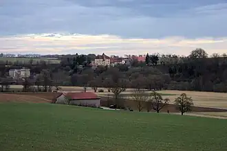 ![]() Vorne links die Heuchlinger Mühle, in der Mitte das Deutschordensschloss