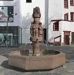 Über der achteckigen Brunnenschale hat sich der Bildhauer selbst porträtiert. An der zur Fußgängerzone gewandten Seite des Brunnenschafts schaut Willi Hahn hervor, in beiden Händen sein Steinmetzwerkzeug haltend. Auf der gegenüberliegenden Seite ragen seine Füße aus der Säule heraus. Weiter oben sind die Figuren von fünf Trierer Originalen am Brunnenschaft angelehnt. Bekrönt wird den Brunnen von einer überlebensgroßen Heuschrecke.[3]
