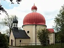 Der Grundriss des Hauptraumes weist ein Quadrat mit 6,5 Metern Seitenlänge auf, das an jeder Seite mit Konchen, halbrunden Apsiden, erweitert wird, so dass insgesamt der Eindruck eines runden Zentralbaus entsteht. Auf den Konchen ruhen Kalottenkuppeln[5] in Form von überdimensionalen Muschelschalen[9], darauf ruht eine mächtige zwiebelförmige Kuppel mit aufgesetzter Laterne von insgesamt 22,7 Metern Höhe. Innen sind die Konchen reizvoll mit riesigen Muschelschalen überwölbt. Darüber ist ein pyramidenähnliches Klostergewölbe aufgesetzt, das in seinen trapezförmigen Feldern vier Ölgemälde mit Szenen aus dem Alten Testament trägt, dazwischen sieht man hochbarocke Stuckaturen. Der nach Westen zeigende Vorbau ist niedrig und in die Länge gezogen und besitzt einen Dachreiter für die drei Glocken. Die Sakristei auf der südöstlichen Seite ist zweigeschossig.