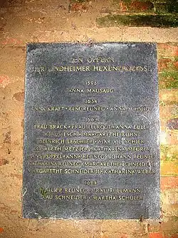 In Lindheim steht als einer der Reste der Ganerben-Burg der sogenannte „Hexenturm“, der während der Prozesse als Gefängnis und Folterstätte diente.[18] Eine Plakette am Turm erinnert an die Opfer.[19]