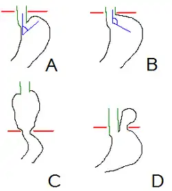 A ist anatomisch normal, B ist eine kardiofundale Fehlanlage, C ist eine axiale Hernie, D eine paraösophageale Hiatushernie