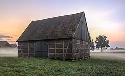 - Schulze-Emptings Mäusescheune: Diese Feldscheune steht vollständig auf Steinfüßen in Pyramidenform und überstehenden Kragen. Somit ist es Schadnagern nur schwer möglich, diese Barriere zu überwinden und die Getreideernte zu befallen. Außerdem bietet diese Bauform Schutz vor aufsteigender Bodennässe. Typisch an dieser Bauform ist das Holz-Ständerwerk – das sogenannte Fachwerk. Untypisch ist jedoch das mittig angeordnete Scheunentor. Meist wird das Scheunentor auf der gegenüberliegenden Seite wiederholt, so dass mit einem Pferdegespann – einem Leiterwagen – die Scheune durchfahren werden konnte. Die Scheunendurchfahrt ist häufig zu einer Seite versetzt. Auf der einen, breiteren Seite wurden im Sommer zur Ernte die Getreidegarben abgelagert. In den Herbst- oder Wintermonaten wurde dann die Dreschmaschine in der Scheunendurchfahrt platziert. Die Getreidegarben wurden von der einen, breiteren Seite zugeführt, das gedroschene Getreide in Jutesäcken abgefüllt und auf der schmaleren Seite der Scheune abgelagert. Die Scheune wird übrigens oft Hiddingsel zugeordnet, gehört jedoch zur Bauerschaft Rödder (Dülmen-Kirchspiel).