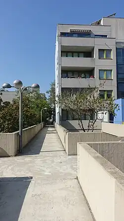 - die westlichste Wohnzeile mit abgeschrägtem Eingangsbereich, die ohne Anbindung an die Decks vom Straßenraum her herkömmlich erschlossen wird.[16]