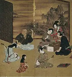 - Auf dem zweiten Schirm Rechts daneben sitzen zwei Frauen und ein Mann an einem Sugoroku-Spiel. Diese beiden Gruppen sitzen vor einem Stellschirm, auf dem eine Landschaft, gemalt in der Art der Kanō-Schule, zu sehen ist.