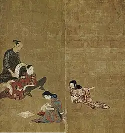 - Der erste zeigt eine Gruppe von Personen, einen alten blinden Shamisen-Spieler, zu dem noch zwei weitere Shamisen-Spielerinnen gehören und dazu ein lauschendes Mädchen mit einer Teetasse.