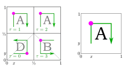 Die Transformation spiegelt für ihr Argument an der »Nebendiagonalen« (strichpunktiert in Abbildung 4), wodurch sich der Drehsinn des Quadrats ändert. Danach wird das gespiegelte Ergebnis um in -Richtung, also ins rechte untere Teilquadrat verschoben, so dass die Eintrittsecke rechts oben liegt – an der Stelle der Austrittsecke des vorangehenden Teilquadrats mit – und die Austrittsecke mit der Austrittsecke des Ausgangsquadrates übereinstimmt (rechts unten).