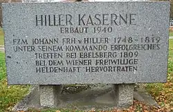 Benannt wurde die Kaserne am 15. Mai 1967 nach Johann Freiherr von Hiller. Dieser befehligte die österreichischen Truppen im Kampf um Ebelsberg.[19] Beim Ausbruch des fünften Koalitionskriegs von 1809 führte Hiller das VI. Armeekorps im Heer des Erzherzogs Karl an.[20] Es wurden ihm weitere Verbände unterstellt, sodass er Befehlshaber über alle Truppen ob der Enns wurde. Am 20. April wurde er von Napoleon angegriffen und nach Landshut zurückgedrängt. Bald darauf gelang es Hiller am 24. April bei Neumarkt (Oberpfalz), die Franzosen unter Bessières zu schlagen. Für diesen Sieg wurde er mit dem Kommandeurkreuz des Maria-Theresia-Ordens ausgezeichnet.[21] Er ging nach Linz zurück und schlug sich am 3. Mai erfolgreich gegen den Angriff der Franzosen in Ebelsberg.[22]