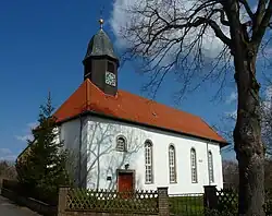 Die Dorfkirche St. Petri dient der evangelischen Gemeinde und liegt am östlichen Ortsrand auf dem Kirchberg. Der schlichte verputzte Bau unter abgewalmtem Satteldach weist hohe Rundbogenfenster auf. Der leicht eingezogene Chorraum ist polygonal abgeschlossen. Die Kirche ist im Kern spätmittelalterlich und wurde mehrfach baulich geändert. 1695 erfolgte eine Erweiterung des Baus und 1721 wurde ein Dachreiter aufgesetzt.[10] Im Inneren befindet sich eine Orgel von Balthasar Conrad Euler. Eine Kanzelaltarwand des 18. Jahrhunderts wurde 1967 entfernt. Seit 1991 ist anstelle eines Altarbildes ein dreiteiliger Wandteppich mit Darstellungen aus dem Leben des Simon Petrus im Altarraum mittig frei aufgehängt.