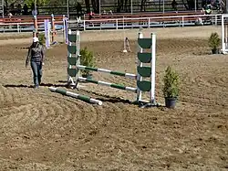 - Ein Kreuz ist in der Mitte niedriger[6] und leitet das Pferd dazu, mittig zu springen. Kreuze sind im Training und der Ausbildung sehr beliebt, kommen auf Turnieren jedoch nur in Einstiegswettbewerben und auf Abreiteplätzen vor. Durch Stangen, die vor, unter oder hinter dem Sprung am Boden liegen, kann das Pferd geleitet werden. Eine Stange am Boden unter dem Sprung erleichtert dem Pferd das Taxieren. Eine Vorlegestange ungefähr 3 m vor dem Sprung hilft dem Pferd beim Anreiten des Sprungs.[7] Eine Stange im richtigen Abstand nach dem Sprung regt das Pferd dazu an noch einmal aufzupassen, sodass es nach dem Sprung nicht davonstürmt.