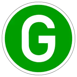 Rundes Zeichen mit weißem Buchstaben „G“ in Schriftgröße h = 125 mm (gemäß DIN 1451, Teil 2) in einem grünen Kreis von 200 mm Durchmesser, um den Kreis ein weißer Rand von 10 mm Breite. Nicht retroreflektierend, Farbtöne gemäß Farbtonregister RAL 840 HR, Farbton für weiß: RAL 9001 und für grün: RAL 6001.