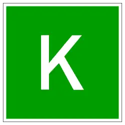 Quadratisches Erkennungszeichen mit weißem „K“ auf grünem Grund.[1] Wird oft in den Formaten 100 × 100 mm, 150 × 150 mm und 200 × 200 mm angeboten.