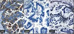 - ↑ Park et al.: Panels of immunohistochemical markers help determine primary sites of metastatic adenocarcinoma. In: Archives of Pathology & Laboratory Medicine, Band 131, Nummer 10, Oktober 2007, S. 1561–1567, ISSN 1543-2165. doi:10.1043/1543-2165(2007)131[1561:POIMHD]2.0.CO;2 (zurzeit nicht erreichbar). PMID 17922593.