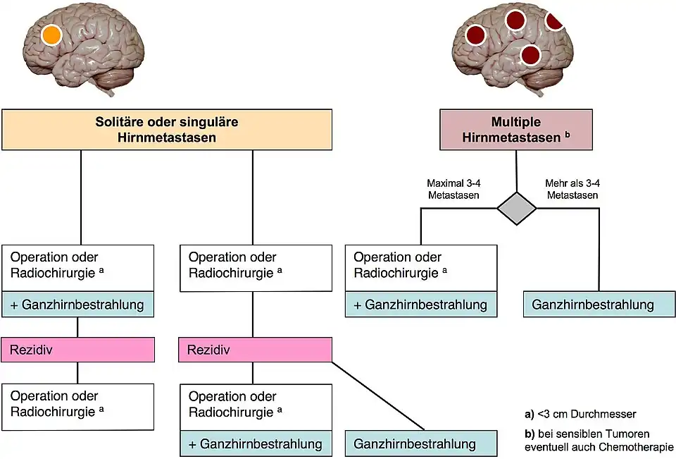 Bei ausreichend gutem Allgemeinzustand des Patienten werden solitäre und singuläre Hirnmetastasen nach Möglichkeit vollständig operativ reseziert. Wesentlich für die Entscheidung zur Operation sind der Allgemeinzustand des Patienten, das Stadium der Tumorerkrankung und die operative Zugänglichkeit der Hirnmetastase. Wenn die genannten Bedingungen zutreffen, kann in Einzelfällen auch bei zwei oder drei gut erreichbaren Metastasen operiert werden. Hirnmetastasen kleinzelliger Bronchialkarzinome werden im Allgemeinen nicht operiert, da sie auf Strahlen- und Chemotherapie gut ansprechen.