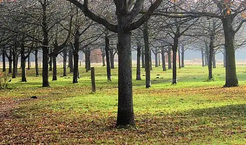 Der Hiroshima-Hain entstand in den Jahren 1987 mit der Pflanzung der spendenfinanzierten[2] Kirschbäume, 1992 mit der Aufstellung der Granitplatte mit dem Bildnis der Göttin Kannon und 2000 mit Kunstinstallationen des Künstlers Klaus-Dieter Kappenberg (* 28. Juli 1945; † 15. Mai 2012).