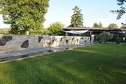 Zwölf Bronzefragmente, ein Teil des „Esther-Reliefs“ von Rick Wienecke, zieren die Mauer entlang des Wegs, der zum Hirzen Pavillon führt.