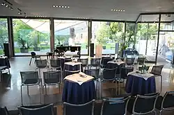 Konzertsaal des Hirzen Pavillons mit Blick auf den Garten und die Villa zu den Hirzen