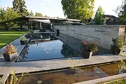 Die wohl augenfälligste Verbindung zwischen Innen- und Aussenraum ist die Quarzitsteinmauer, die von der Parklandschaft her in einem spitzen Winkel die Glasfassade durchdringt. Sie gliedert Raum und Baukörper und geleitet den Besucher über Wasserflächen in den Pavillon. Auch das Wasser, das in verschiedenen Tiefen die Mauer umspielt, setzt sich in den Pavillon hinein fort.