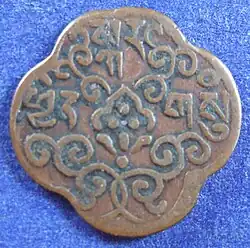 Zu dieser Zeit liefen in Nepal geschlagene Silbermünzen um. Anfangs waren dies die der Newari-Königreiche Kathmandu, Patan und Bhaktapur. Nach 1767 liefen Münzen der frühen Saha-Dynastie, die im Auftrag der tibetischen Herrscher hergestellt worden waren, um. Dazu kamen ältere Prägungen der Malla-Dynastie. In Lhasa wurde versucht, selbst Münzen nach den Newari-Vorbildern herzustellen. Es war üblich, zur Gewinnung von Wechselgeld die Münzen in kleinere Stücke zu schneiden. Der ausführende Silberschmied zwickte üblicherweise für seine Leistung ein weiteres Eckchen ab, ohne jedoch das Blütenmuster auf der Münze zu beschädigen, welches den Wert des Bruchstückes bestimmte.