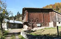 Das Werkstattsgebäude und die Scheune liegen westlich des Dorfes am alten Weg nach Rueun. Giger ersuchte die Gemeinde um eine Bewilligung für eine Wasserzuführung zu seiner Werkstätte. Die Gemeinde verwehrte Giger jedoch dieses Recht. Auf der anderen Seite des Grenzbaches war Giger erfolgreicher: Die Gemeinde Rueun erlaubte ihm die Erstellung eines Wasserrades. Die grenzüberschreitende Transmission vom Wasserrad auf dem Boden der Gemeinde Rueun zur Werkstatt auf Schnauser Boden ist 75 Meter lang. Das Unterschlächtige Wasserrad dreht mit rund 90 Umdrehungen pro Minute.