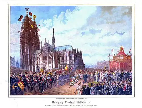 Auf diesen ersten Durchgang folgte eine Zeremonie, mit der der verstorbene König Friedrich Wilhelm IV. als Förderer der Domvollendung geehrt wurde. Junge Männer in historischen Trachten und weißgekleidete Fahnenschwenker versammelten sich um die monumentale Büste des Königs gegenüber dem Kaiserpavillon und legten Kränze nieder. Dazu sang ein Knabenchor Hymnen zur Huldigung des Königs, während die Gäste einschließlich des Kaisers sich erhoben hatten.[3]