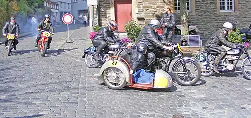 - Schiebestart: Hier ist der Motor beim Start aus und das Motorrad wird erst beim Startsignal angeschoben (Motorradgespanne und Rennmotorräder vor 1987)