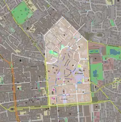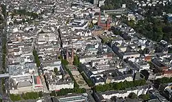 Innerhalb des Fünfecks liegt der mittelalterliche Stadtgrundriss mit vielen historischen Gebäuden, wie dem Stadtschloss der nassauischen Herzöge am Schlossplatz, dem Alten Rathaus, dem Neuen Rathaus und der Marktkirche, sowie am westlichen Rand das älteste erhaltene Bauwerk der Stadt aus der Römerzeit, der Heidenmauer.