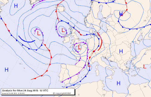 Dann stellte sich vor den Fronten des mächtigen Islandtiefs der Vortage wieder eine Südströmung ein,[186] mit über 35 Grad in Portugal und Spanien ab dem 17. August,[187] bis zu 33 Grad in den Fönlagen Südwestfrankreichs und bis zu 30 Grad in Südostengland am 22. August.